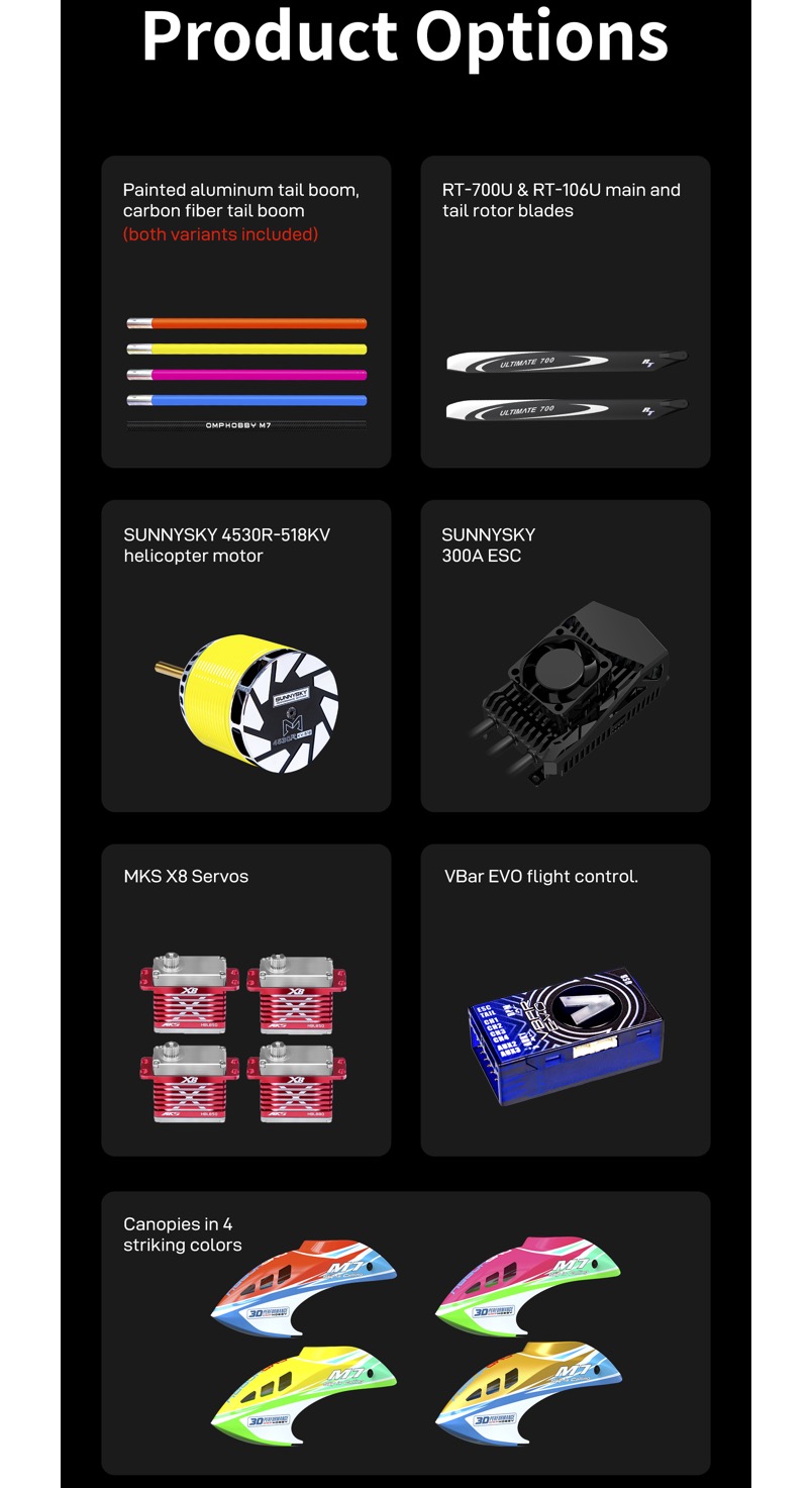 | Version | Kits(Excluding Blades), Kits+Blade(with RotorTech 700mm blades and 106mm tail blades), Kits+Motor(with SUNNYSKY H4530 Yellow motor. Excluding Blades), Kits+Motor+ESC(with SUNNYSKY H4530 (Y) motor SUNNYSKY 300A ESC. Excluding Blades), Kits+Motor+ESC+Vbar(with SUNNYSKY H4530 (Y) motor. VBar EVO. SUNNYSKY 300A ESC. Excluding Blades), Kits+Motor+ESC+Vbar+Blades+Servos(with SUNNYSKY H4530 (Y) motor. VBar EVO. SUNNYSKY 300A ESC. RT700U and MKS (HBL850*3 HBL880*1) |